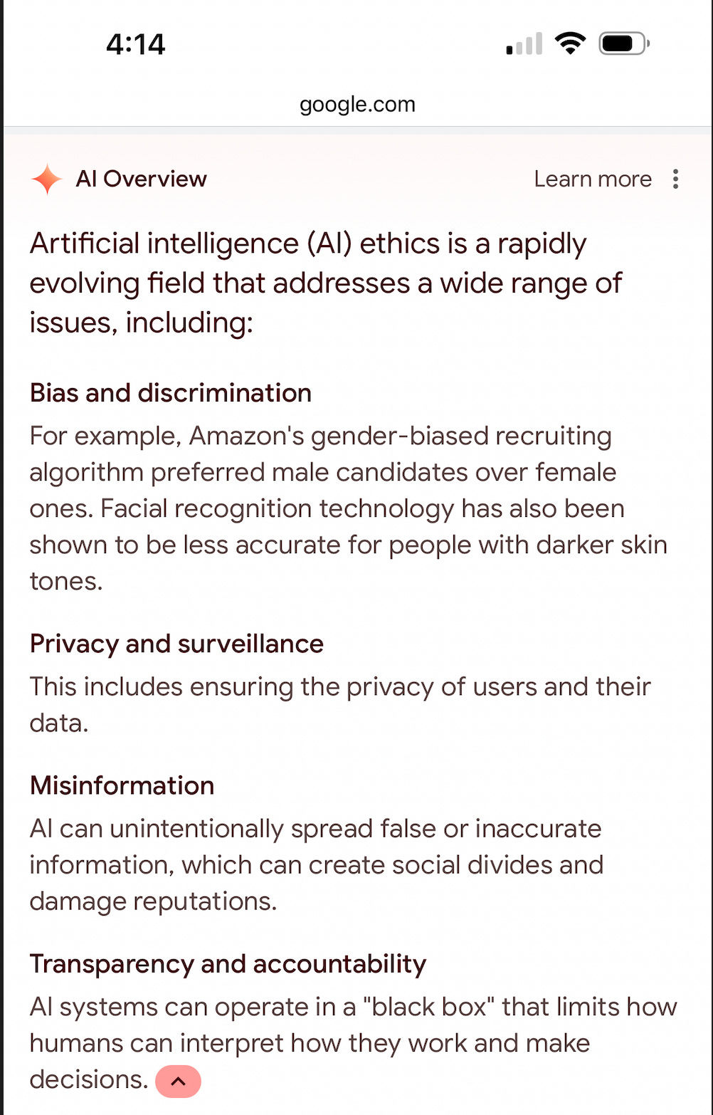 It is ironic that when I Googled “AI ethics issues examples” yesterday, I got the following response: